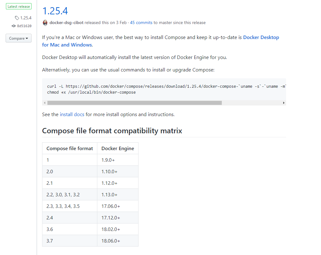 도커 컴포즈를 설치하기 위해서, 먼저 github 주소에서 다운받을 바이너리를 확인한다.