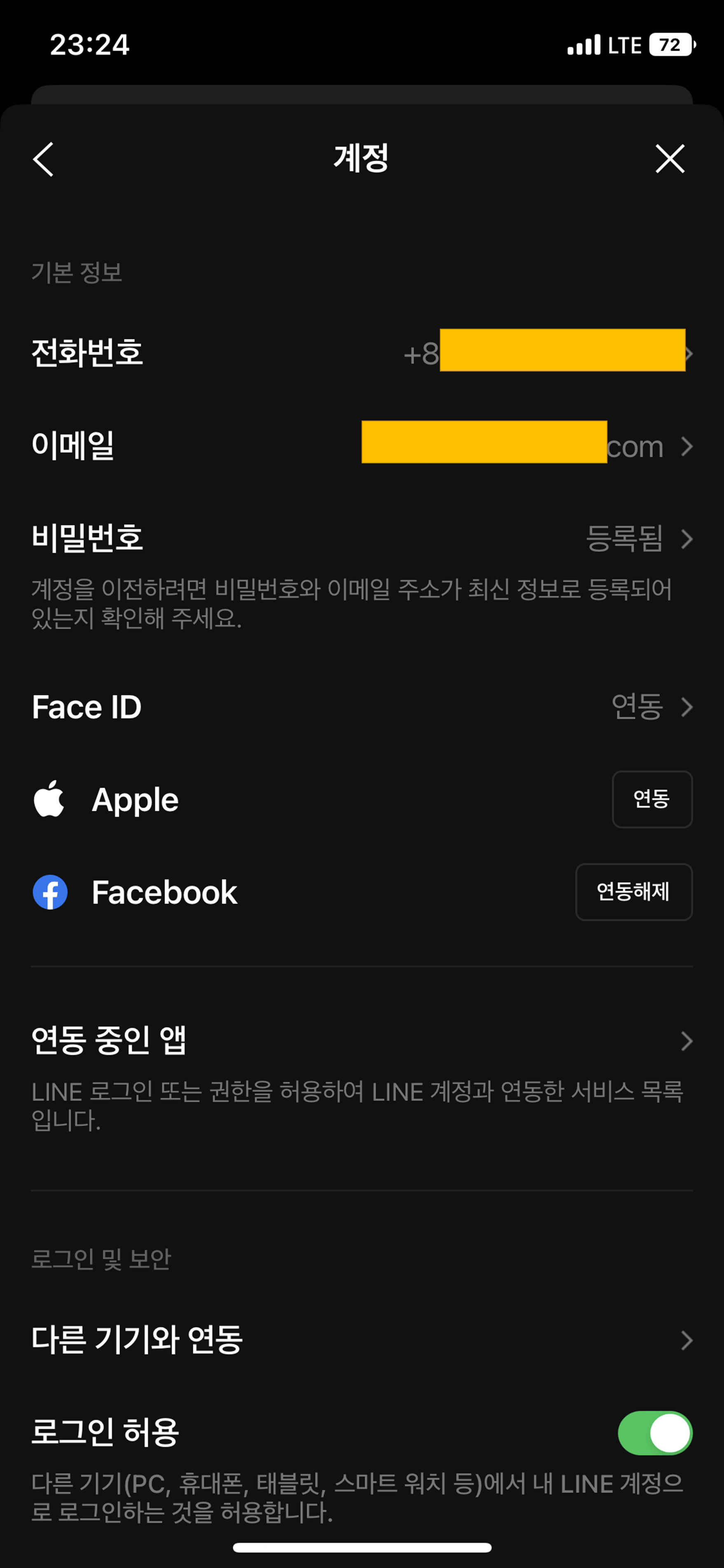 전화번호와 이메일을 등록하고, 로그인 허용 옵션을 활성화합니다.