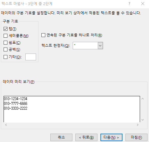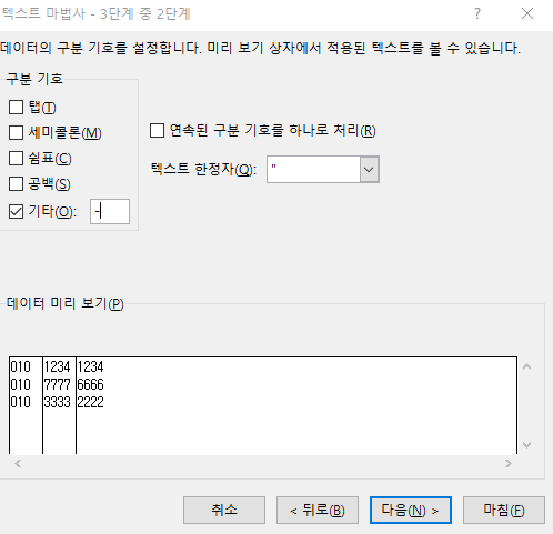 그럼 데이터 미리 보기 상자에서 볼 수 있듯, 해당 문자를 기준으로 데이터가 구분된 것을 볼 수 있다.