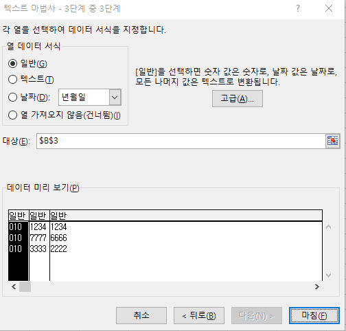 여기서 '마침' 버튼을 누르면 기존에 하나로 뭉쳐져 있던 문자열이 3개의 열로 나눠서 출력되는 것을 확인할 수 있다.