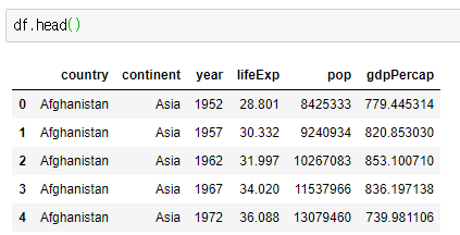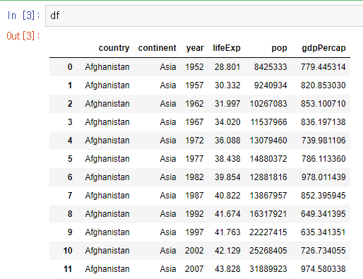 위에서 볼 수 있듯 데이터 프레임에는 'country', 'continent', 'year', 'lifeExp', 'pop', 'gdpPercap' 열이 존재함을 알 수 있다.
