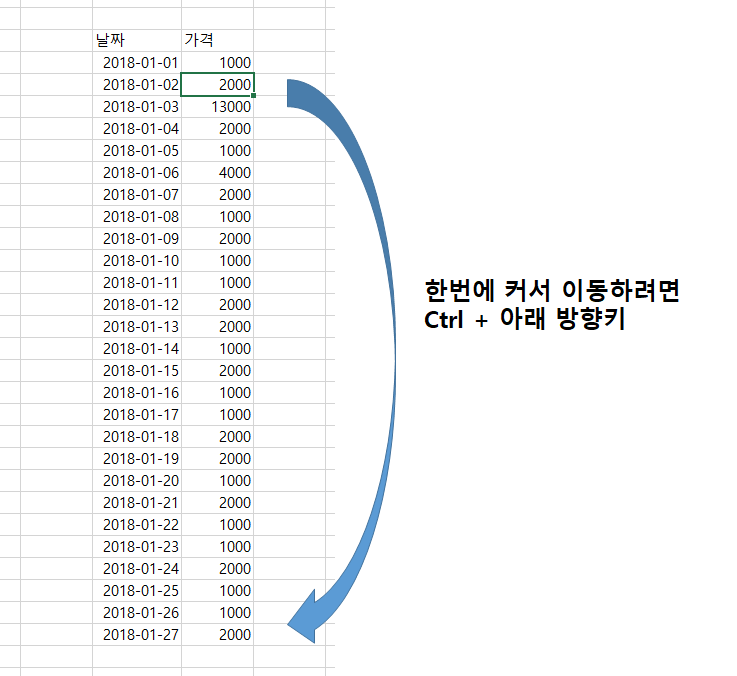 Ctrl + 아래방향키를 누르면 특정열의 맨마지막 원소가 있는 곳으로 한번에 이동하게 됩니다.