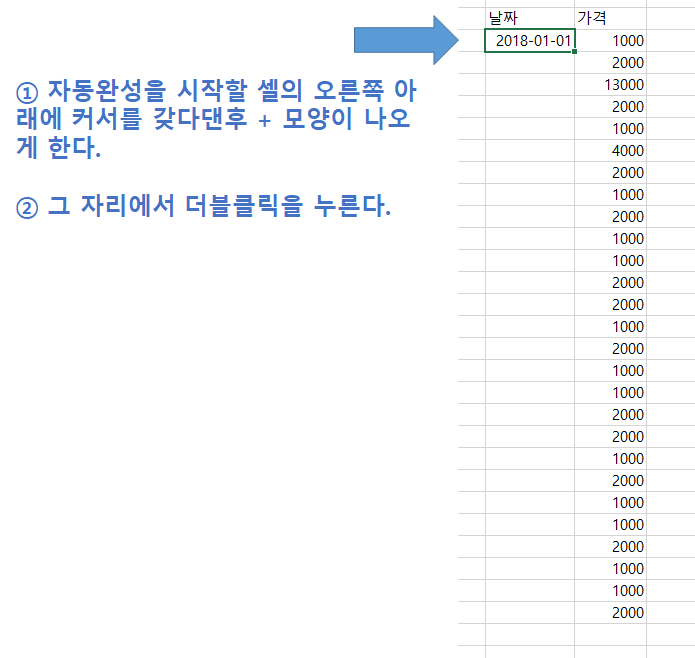 다만 이 방법은 자동완성을 적용할 열의 왼쪽이나 오른쪽에 데이터가 채워져 있어야 합니다.
