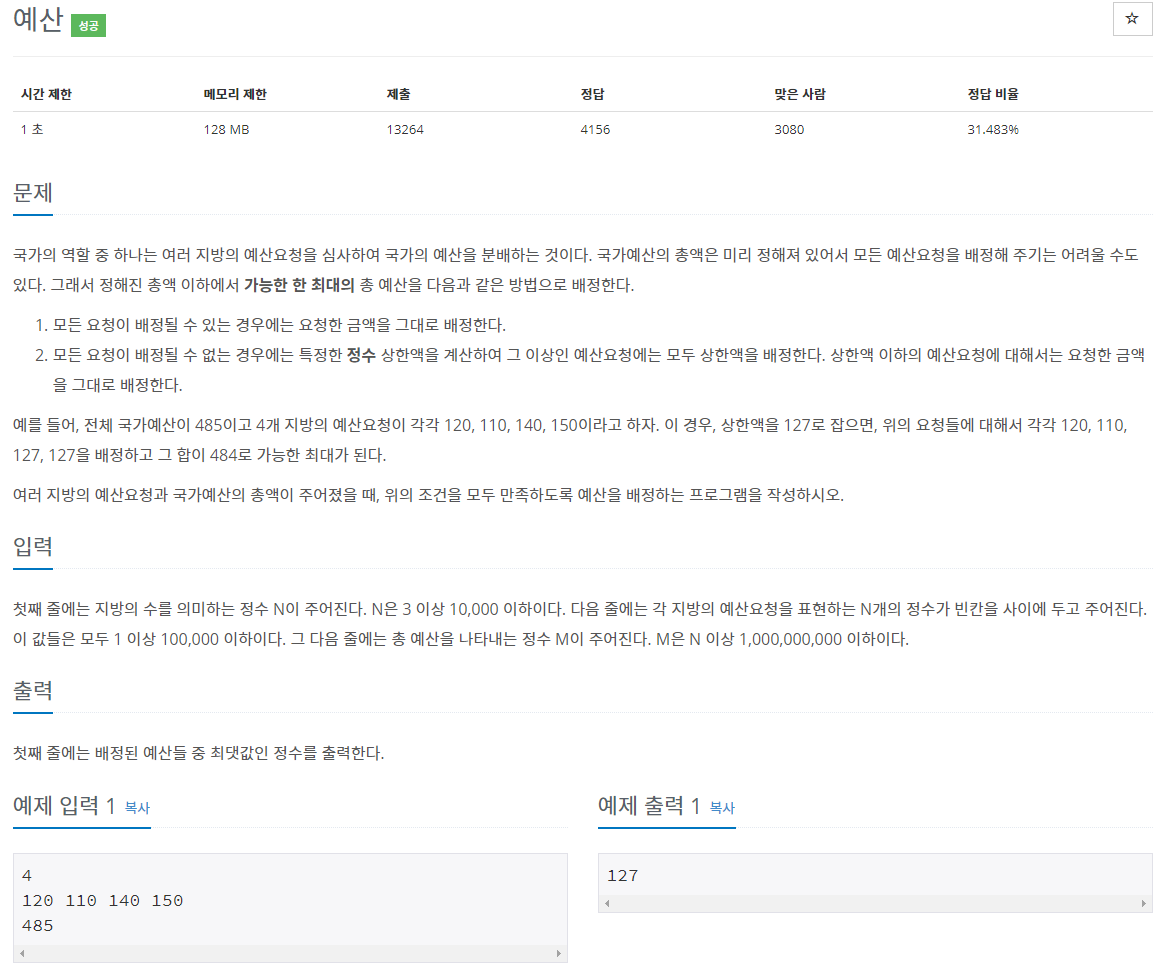 첫째 줄에는 지방의 수를 의미하는 정수 N이 주어진다. N은 3 이상 10,000 이하이다. 다음 줄에는 각 지방의 예산요청을 표현하는 N개의 정수가 빈칸을 사이에 두고 주어진다. 이 값들은 모두 1 이상 100,000 이하이다. 그 다음 줄에는 총 예산을 나타내는 정수 M이 주어진다. M은 N 이상 1,000,000,000 이하이다.