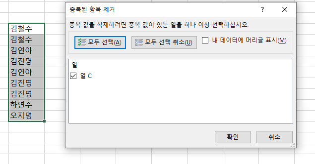 2. 중복을 제거하거자 하는 열 선택 후 확인 버튼 클릭